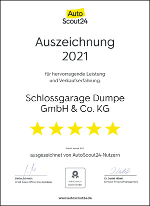 Die Händler-Auszeichnungen von AutoScout24, dem europaweit größten Online-Automarkt, sind echte Publikumspreise. Sie basieren auf ca. 600.000 Online-Bewertungen der Marktplatz-Nutzer. Diese können Autohäuser in fünf verschiedenen Kategorien mit bis zu fünf Sternen bewerten: Gesamteindruck, Erreichbarkeit, Zuverlässigkeit, Angebotsbeschreibung und Kauferlebnis. Schlossgarage Dumpe GmbH & Co. KG hat bisher 68 und durchschnittlich 4,7 Sterne gesammelt.